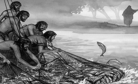 Quando già era l’alba, Gesù stette sulla riva, ma i discepoli non si erano accorti che era Gesù. Gesù disse loro: «Figlioli, non avete nulla da mangiare?». Gli risposero: «No». Allora egli disse loro: «Gettate la rete dalla parte destra della barca e troverete». La gettarono e non riuscivano più a tirarla su per la grande quantità di pesci. Allora quel discepolo che Gesù amava disse a Pietro: «È il Signore!». Simon Pietro, appena udì che era il Signore, si strinse la veste attorno ai fianchi, perché era svestito, e si gettò in mare. Gli altri discepoli invece vennero con la barca, trascinando la rete piena di pesci: non erano infatti lontani da terra se non un centinaio di metri.